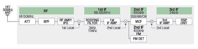 ・ホワイトLEDによるフルキーイルミネーション ・レベル調整が可能なスピーチプロセッサー ・3ステージパラメトリックマイクイコライザー機能(SSB/AMモード) ・VFOスキャン/メモリースキャン/プログラマブルメモリースキャン機能 ・音声による送受信切替機能(VOX) ・50通りのトーンと104通りのDCSの設定 ・送信時の各種メーター表示 (送信出力表示/ALC電圧表示/アンテナの整合状態(SWR)表示/ドレイン電流表示) |