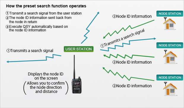 When a node is found, the operating frequency is switched to that of the node automatically, and the node ID and city name will appear on the screen since the node automatically transmits the ID information in return on receiving the search signal.