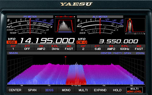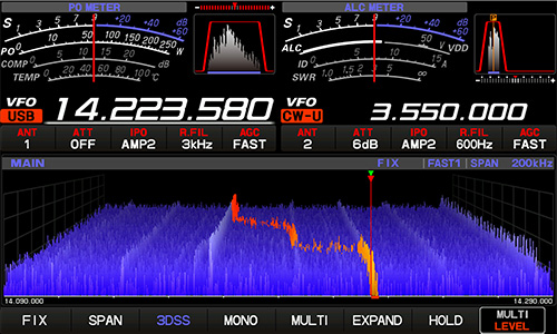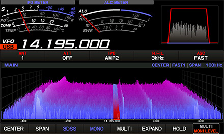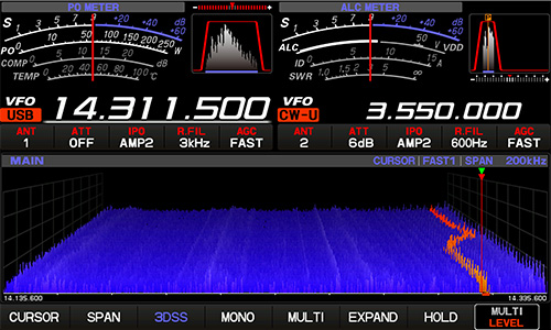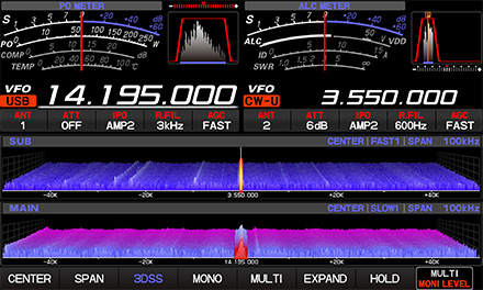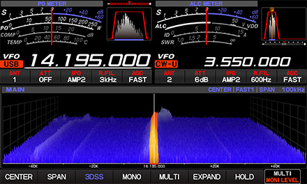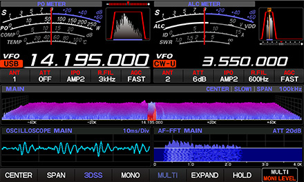 ディスプレイのMULTI 表示はスコープ表示に加え、オシロスコープとAF-FFTのオーディオスコープを同一画面に表示させます。これにより、運用中に受信バンドをモニターしながら同時に受信音のスペクトラムを表示するAF-FFT機能で相手局の送信電波のオーディオ特性を見ることや、受信部のIFフィルターや混信除去機能を調整する際にも、その効果を視覚的に確認することができるので、コンテスト時などにおいて瞬時に全体のコンディションを把握することができます。また、自局の送信電波のオーディオ特性も確認が可能ですので、パラメトリックマイクイコライザーなどのマイクの調整などにも効果的です。