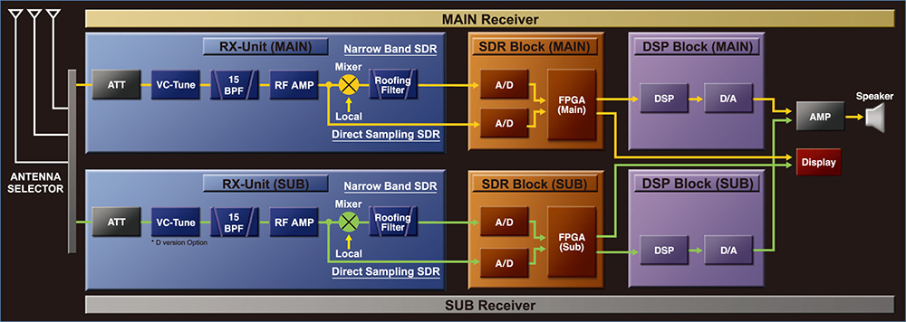 FTDX101シリーズのメイン、サブ受信部は、RFフロントエンドからSDRに至るまで完全に独立したデュアル受信回路構成で、狭帯域化が可能なスーパーヘテロダイン方式により不要な周波数成分をルーフィングフィルターにより十分減衰させてからA/Dコンバータによりデジタル処理を行うナローバンドSDR方式を採用、混変調特性に優れたミキサー回路、400MHzから直接ローカル周波数を発生させる高分解能HRDDS基準発振回路の採用など、回路全体の高性能化により14MHz帯における2KHz近接BDR(ブロッキングダイナミックレンジ)は150dB以上、RMDR(レシプロカルミキシングダイナミックレンジ)は123dB以上、3rd IMDR(3次相互変調ダイナミックレンジ)は110dB以上に到達します。