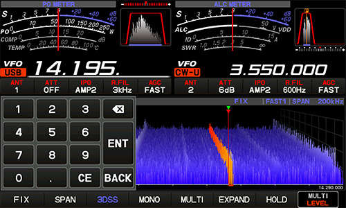 ”FIX”キーを長押しするとスコープのスタート周波数をダイレクトに入力することができ設定のSPANでバンドの状態をモニターすることができます。FIXモードとカーソルモードでは、バンド内に多数の信号が出ている場合に、マーカーの軌跡が3DSSディスプレイに明確に表現され効率よく信号のチェックができます。-