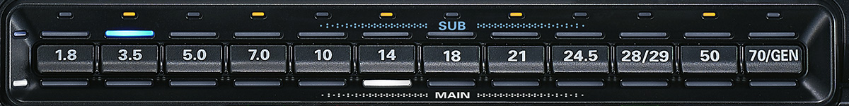 ABIは、従来のバンド切り替えスイッチを横一列にVFO上部に配置、MAINバンドで選択されているバンドは白色に、SUBバンドで選択されているバンドは青色のLEDが点灯します。送信時は、送信側のLEDが赤色になりどちらのVFOで送信しているかも瞬時に確認することができます。またバンドキーを長押しすると橙色のLEDが点灯しますので、アンテナを接続してあるバンドを表示したり、DXペディションで運用するバンドを表示するなどメモ代わりに使うことができます。