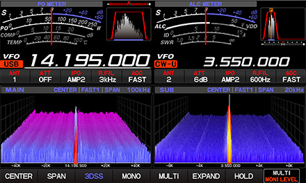 MAINまたはSUBバンドの周波数帯の情報だけを表示するモノラル表示とデュアル受信時のMAINとSUBバンドの状況を画面表示するデュアル表示から選択することができます。スコープ画面のデュアル表示は、MAINバンドとSUBバンドの情報を上下、左右に分割表示することやスコープ部の表示エリアを拡大するEXPAND 表示、フィルター機能の状態を拡大して微調整を容易に行うことができるなど、状況に応じて多彩なディスプレイ表示を選択することが可能です。