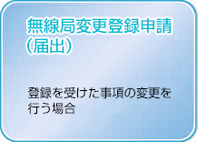 無線局登録申請は、無線従事者の資格を必要とせずに、利用者が無線機を運用(使用)できるようにするために電波法にしたがっておこなう手続きです。無線局登録申請には、次の2つの種類があります。 変更登録申請(届出)のしかた登録局または包括登録に係る登録局の事項を変更しようとする場合や登録人の名称や住所に変更が生じた場合には、変更登録申請または届出が必要になります。 ※包括登録申請でご利用中のお客様が、増設で82Ch対応の新制度適合機を利用する場合は、周波数範囲が変更となるため、包括登録の変更申請(登録局変更登録申請書)の提出が必要となります。 >> 総務省のサイトへリンクします。https://www.soumu.go.jp/soutsu/kanto/ru/kani/cr_touroku.html https://www.soumu.go.jp/main_content/000905390.pdf |