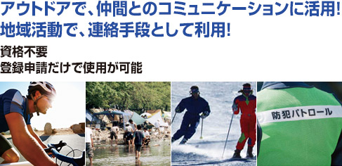 デジタルトランシーバーは、アウトドアのレジャーや地域活動での連絡に最適な広いカバーエリア。優れた防水性能はもちろんのこと、仲間全員を一度に呼び出したり、ケータイ電話が圏外のところでも使えたりと、とても便利なコミュニケーションツールです。個人の資格や免許申請は不要で、登録手続きをして登録状が交付されればすぐに使用できます。