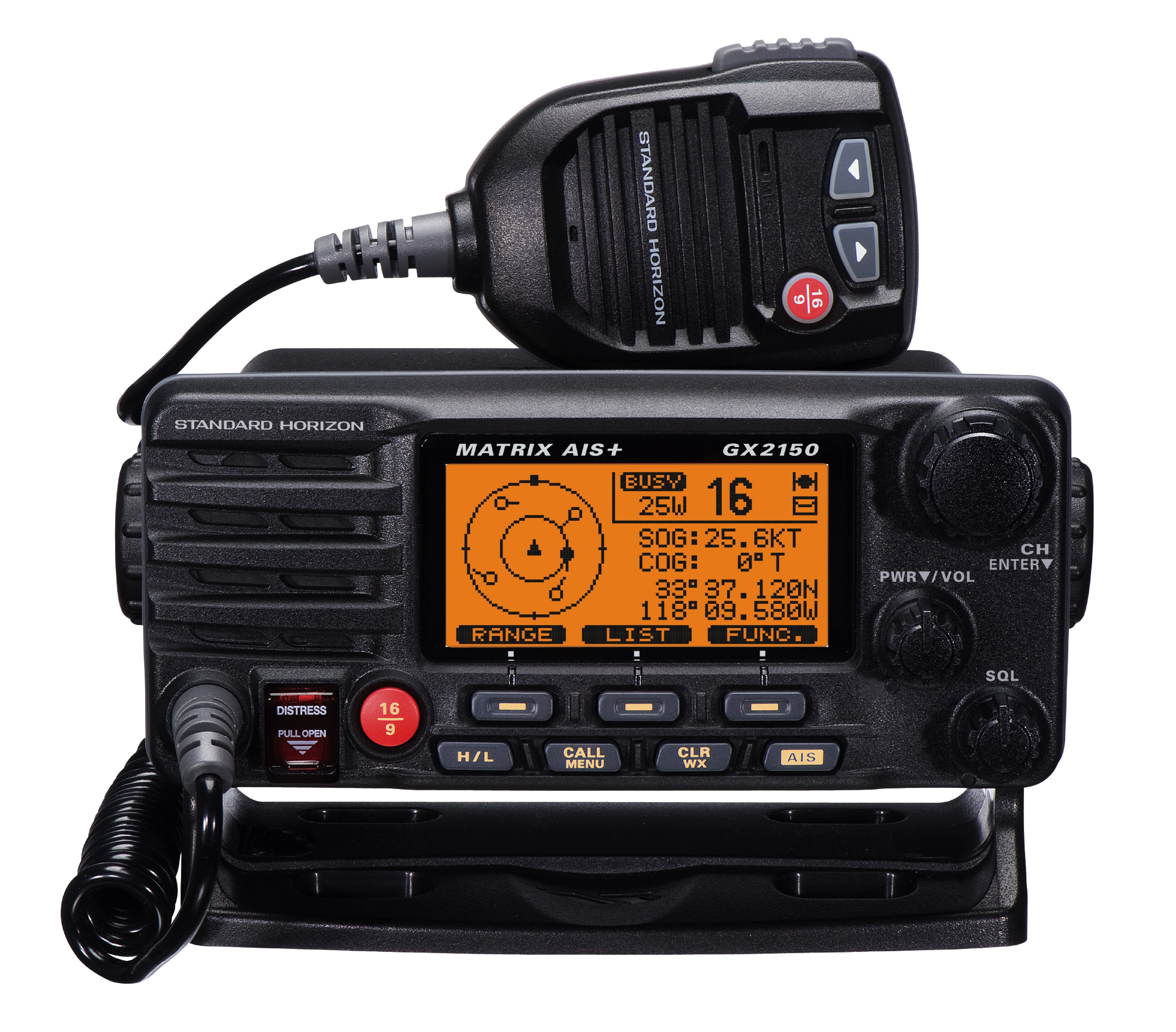 Dual Channel AIS Receiver Built-inThe MATRIX AIS+ GX2150 has a dual channel AIS receiver built-in which allows you to see AIS targets simply by connecting a GPS with NMEA 0183 output and a marine VHF antenna. To show your vessels position in relation to AIS targets press the dedicated AIS key. The AIS display is capable of showing MMSI, Call Sign, Ship Name, BRG, DST, SOG and COG of AIS targets. You may also contact an AIS Ship directly using Digital Selective Calling. Two alarms (CPA and TCPA) may be setup to alert you when an AIS ship may be approaching to close to your location. In addition the GX2150 can be connected to a compatible GPS chart plotter (which can use NMEA 0183 VDM sentence at 38400 baud) to show AIS targets.