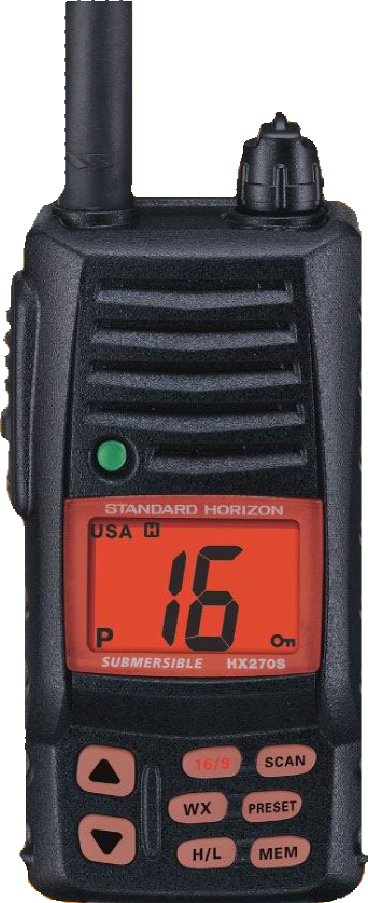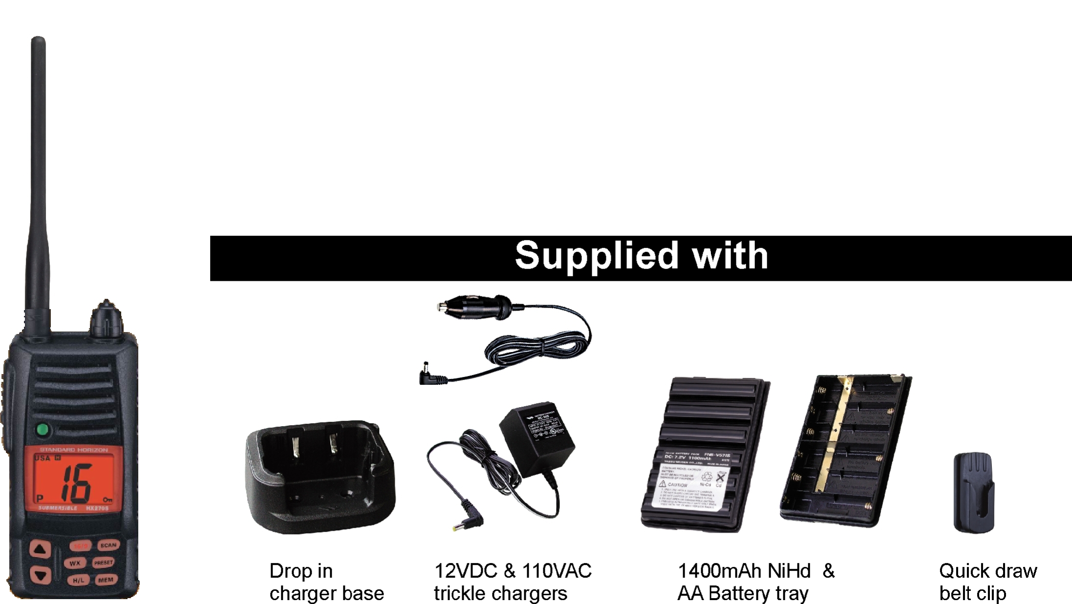 AccessoriesThe accessories supplied with the Standard Horizon HX270S are unmatched; a 1400mAh Nickel Metal Hydride battery that will last over 18 hours (5/5/90 duty cycle) when transmitting at 5W. Also included is a waterproof alkaline battery tray, 12VDC Charger, 110VAC changer and a desk top drop-in cradle to charge the radio on shore or on your boat.