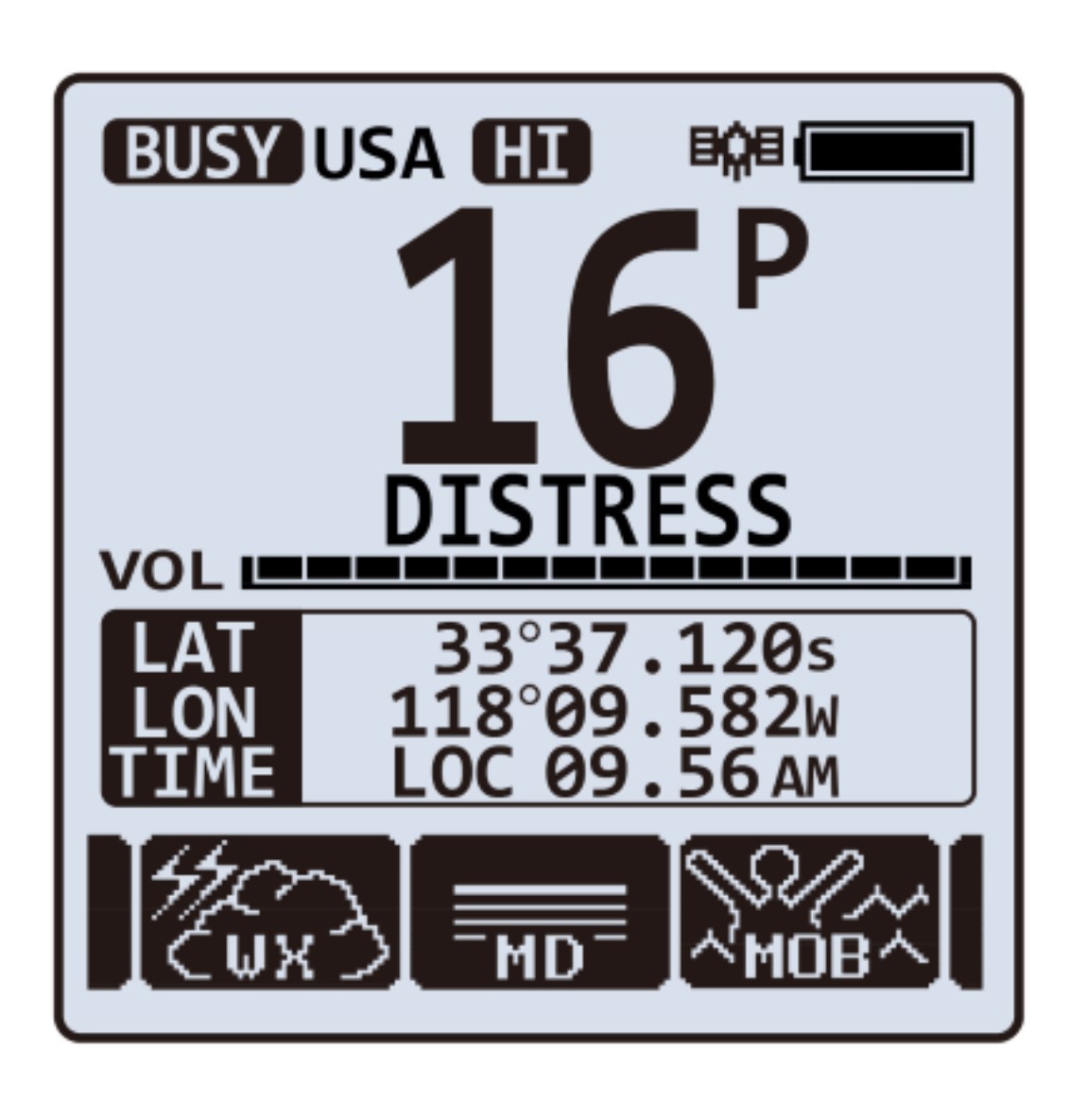 Oversized full dot matrix displayThe HX870 boasts one of the largest displays in a hand held VHF radio. Measuring 1.7" wide by 1.7" tall, or 2.3" diagonal. With a larger display, greater (dot matrix) resolution, and a super bright backlight there will be no mistaking the information displayed on the face of the radio day or night.